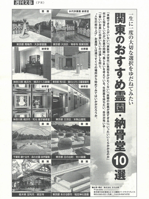 週刊文春に和光磯子納骨堂が取り上げられました真照寺 公式2024年9月16日読了時間: 1分週刊文春の令和6年9月19日号に、和光磯子納骨堂の情報が掲載されました。「関東のおすすめ霊園・納骨堂10選」にひとつとして取り上げられたものです。和光磯子納骨堂を詳しくご紹介していますので、よろしければ、お手にとってくださいませ。■和光磯子納骨堂のウエブサイトはこちらですカラーの別冊(抜き刷り)バージョンもあります。